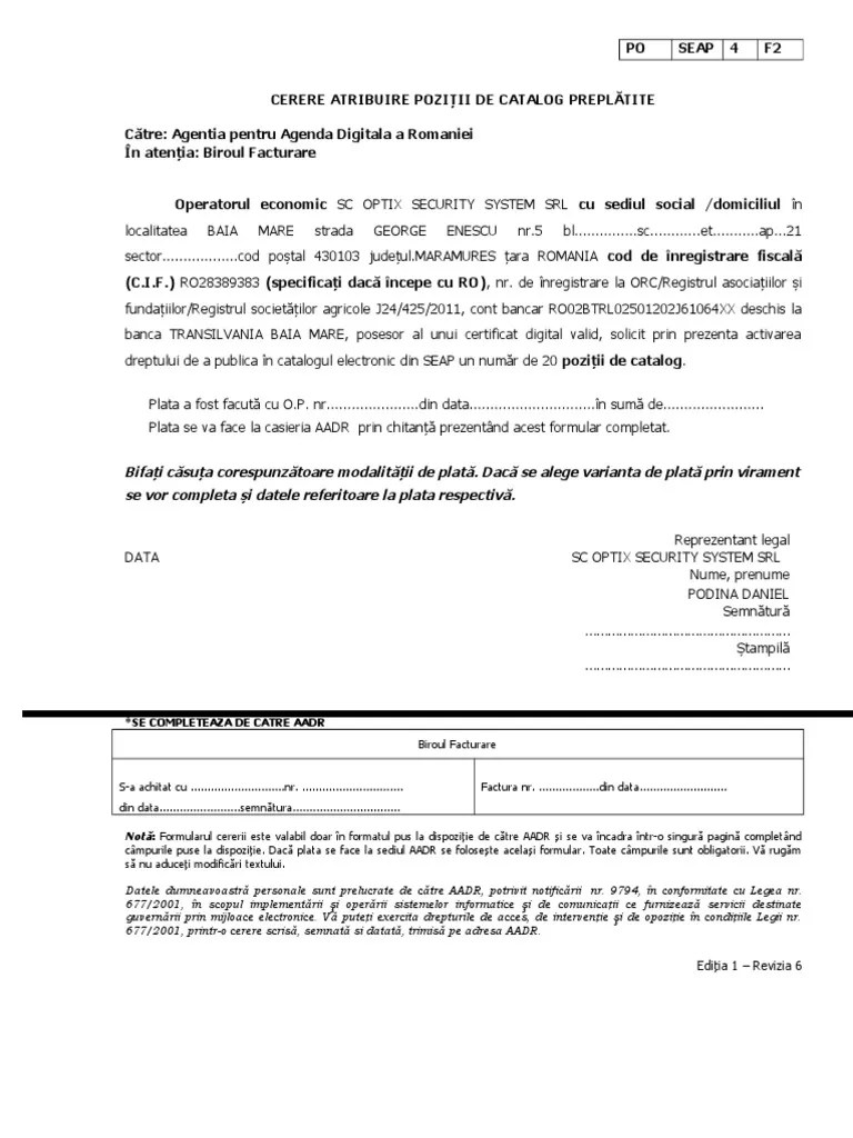 1, cerere de atribuire pozitii in catalog, cererea trebuie completata cu datele de identificare ale firmei pentru a se putea emite factura .